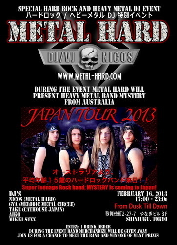 オーストラリアのMYSTERY来日記念アフター・パーティ開催!! Tシャツ、CD、ピックがもらえるかも!? http://www.facebook.com/mysteryrocks http://www.mysteryrocks.net/ 場所: From Dusk Till Dawn http://ameblo.jp/f-d-t-d/ 時間: 17時〜23時 費用: 入場無料(自分の飲食代のみ。ただしお一人様1ドリンクはお願いします。) DJ's: Nicos (Metal Hard) ギャー (Melodic Metal Circle) Mikki Sexx Aiko Take (Cathouse Japan)