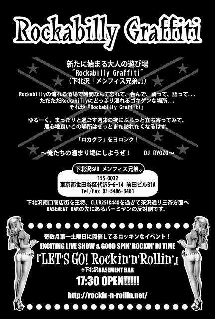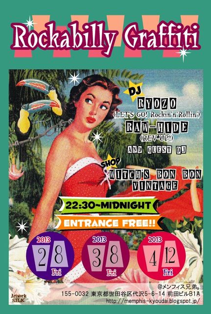 Rockabilly Graffiti 2013.2.8(FRI) @下北沢BAR メンフィス兄弟 http://memphis-kyoudai.blogspot.jp/ 東京都世田谷区代沢5-6-14 前田ビルB1 03-5486-3461 OPNE 22:30〜Midnight エントランスフリー DJ RYOZO(LET'S GO! Rockin'n'Rollin') RAW-HIDE(REV-UP!) AND GUEST DJ Rie(SWANK) SHOP Witch's BonBon Vintag ロカビリーDJによるロカビリーDJイベントです。 勿論!アナログオンリー!!! いい選曲しますよ〜 一度踊りに来てください。