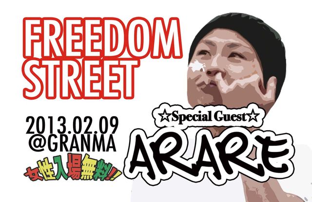 ☆FREEDOM STREET ☆ 場所:bar GRANMA(水戸市大工町1-6-1 ベルスポットビル5F) 2月9日(土)23時開演 入場料:2,000円(25時までに入場の女性に限り入場料無料) -Special Guest- ARARE / MONGOLMAN / DIRTY N HANDSOME -Host Sound- RUMHEAD / LIGHTOUS MOVEMENT / SOUL BEAT / BACK DATE / RUN UP STAR -Dancer- AATY / AYAKO / ICE RUDY SQUAD / SWIMMY -Dee Jay- DACHI / HAYAJIN