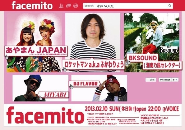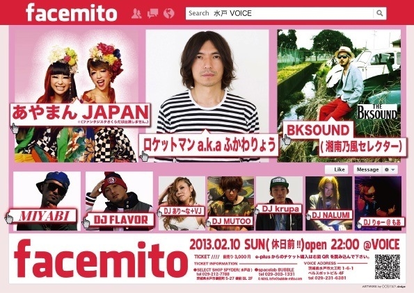 FaceMito FACEMITO 2/10祭日前 22:00~ 水戸 club VOICE [TEL] 029 – 303 – 1331 bubble-mito.com/ 出演者は あやまんJAPAN!!(さくらださんは出演いたしません。。) The BK Sound (from 湘南乃風) ロケットマン (ふかわりょう)!! 水戸からは、、、 MIYABI(ROC THE DEF) DJ FLAVOR(ROC THE DEF) あり〜な+VJ ひめ@音次元 MUTOO NALUMI Krupa!!!! 前売りTICKET‥3000円 『SPYDER 』0292-12-7788 www.spyder-mito.com/ 『e+』(1/