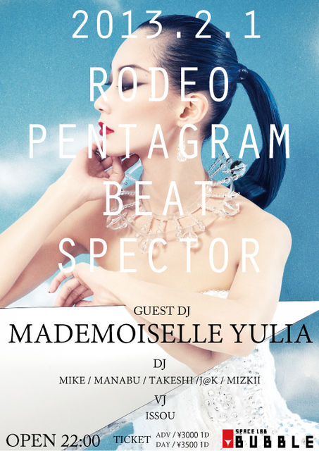 HOUSEシーン最前で活躍したDJにスポットをあてたパーティー。様々な場所で活躍した各ジャンルのDJを揃え、存分に楽しめるバリュー感とHOUSE特有のフロアが踊り騒ぐ雰囲気を楽しんで欲しい。 BUBBLE唯一のHOUSEレギュラーパーティーとして2013年からスタート。第1回を記念してスペシャルゲストDJにマドモアゼルユリアを招聘。 非日常を求めるミュージッ クラバーへ 水戸の【今】をリアルに発信する一夜。 2/1(fri) RODEO PENTAGRAM BEAT SPECTOR @space lab bubble 22:00 OPEN day\3500 1D adv \3000 1D special guest DJ MA
