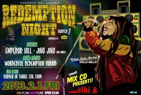 REDEMPTION NIGHTもおかげさまで7回目開催です!! 2013年一発目の今回はズバリ!! Tribute to BOB MARLEY !! オリジナル曲はもちろん、様々な関連曲、カバー曲までボブマーリー率高めの素敵な夜をお届けします!! おなじみ絶好調のEMPEROR HILL SOUND SYSTEMもフロアをROCK!! 毎回大好評GARDEN OF DANIEL,RAS RUBENによるITAL FOODも是非!! 土浦SIKIでお待ちしています!! 今回も先着30名様にMIX CDをプレゼント致します。
