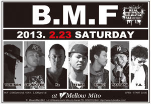 ■2013.2.23(Sat) 22:00open [B.M.F] HipHop & R&B DJ> TOMIKEN. CHUCK-TEE. Kz. STARR. SHINJI. YASTAKA & T.A. FEE: W/F \2.000(1d) : DAY \2.500(1d) ■前売りチケット(ADM)・フライヤー(W/F)はメールにて予約できます。 *希望日・*希望イベント名・*希望枚数・*氏名・*電話番号をご記入の上 下記のチケット/フライヤー申し込みよりイベント前日までに送って下さい。 <注意> * は必修項目です。記入漏れがあるとご希望に添えない場合があります。 チケット/フライヤー申し込み 詳細はTEL.MAILにてお問い合わせ下さい。 TEL 029(221)18