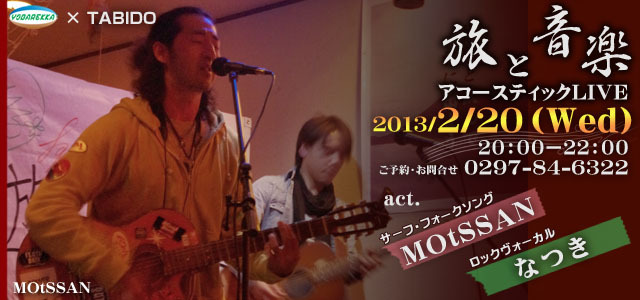 つくば音楽情報御中 ライブ告知をさせていただきます。 宜しくお願いいたします。 ★毎月第3水曜日は…★ 茨城ポータルよばれっか x saloon Bar TABIDOプレゼンツ 【旅と音楽アコースティックライブ】 毎日寒い日が続きますが、竜ヶ崎市saloon bar TABIDOでは、ほんわかあったかいライブが開催! 第11回のアーティストは、哀愁漂う歌声のMOtSSANとロックな茨城っ子、なつきさんです。 毎回、観客とライブの一体感が楽しい旅と音楽アコースティックライブ。 ご来店お待ちしてます! ★入場無料★(投げ銭制になりますので、お気持ちを