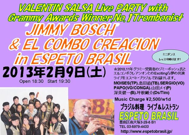 "ジミー・ボッシュ"&"エル・コンボ・クレアシオン"♡バレンタイン♡サルサ ライブ♡パーティーinブラジル料理 ライブ&レストラン"エスペト・ブラジル"