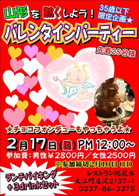 ★35歳以下限定企画です★ 2013年2月17日(日) PM12:00〜16:00頃まで 山形を熱くしよう! バレンタインパーティーだよ〜〜♪^^ ※今回はランチバイキングの他に・・・ チョコフォンデューもやりたいと思います!! 新しい出会いも満載☆友達増やしちゃおう!! チーム戦での楽しいゲームもあるから、会話が苦手な方でも大丈夫^^b 気が付いたら仲良くなれちゃうよ〜!! ■参加費:男性2800円 女性2500円 (3ドリンク付き) ■参加締め切り:2013