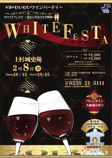 冬には雪が舞い降りる米沢。そして、幻想的な上杉雪灯篭まつりやバレンタインデー。 毎年この季節に、米沢市が主催する青年男女にカップリングの場「ホワイトフェスタ」と、 毎年夏に、米沢商工会議所青年部が主催する出会いと楽しいパーティー「わいわいワインパーティー」が合体しました。昨年は、男女合わせて300人以上の参加があり、開催を重ねるごとに参加者や交際をスタートするカップルの多くなってきています。今年もご参加の皆様に白い天使が舞い降りますように…。 今年は、上杉雪灯篭まつりのプレ点灯式と同時開催いたします。パーティ
