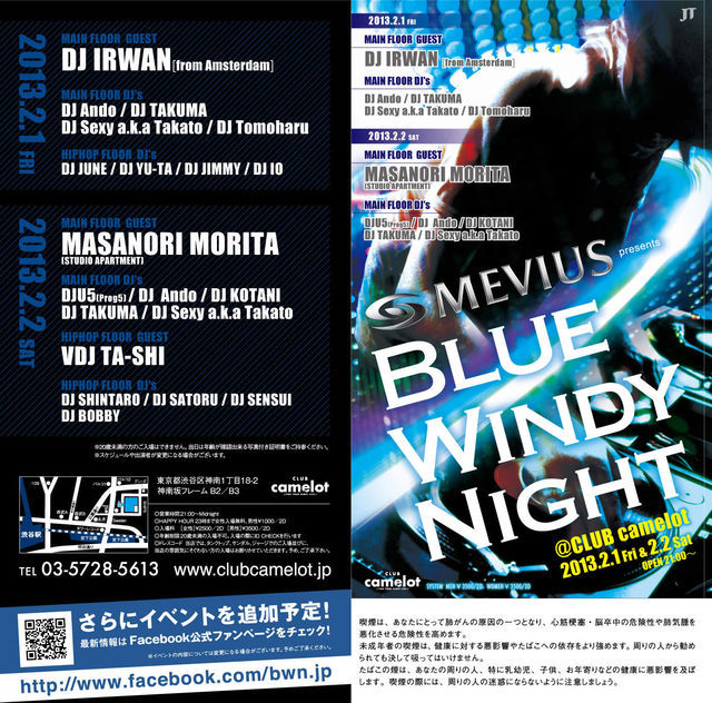 世界水準の選曲で盛り上がり必至!毎回1200人オーバーの盛り上がり! ★☆★☆★☆★☆★☆★☆★☆★☆★☆★☆★☆★☆★☆★☆★☆★☆ 2/1(金)BLUE WINDY NIGHT@CAMELOT 毎週1200人以上のお客さんで盛り上がるビッグパーティー!! ゲスト料金で格安入場!! ゲストDJにはアムステルダムNO.1DJ!DJ DJ IRWAN!! 管理人様告知失礼します。 2/1(金)BLUE WINDY NIGHT Open: 21:00 System: Men¥3500/2D / Women¥2500/2D Happy Hour 21:00~23:00 (Men ¥1000/2D / Women Free Entrance) GUEST DJ IRWAN