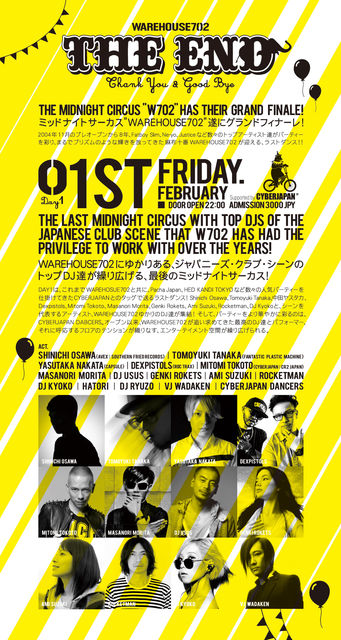 2004年のオープン以来、これまでたくさんの方々の笑顔・音楽と共に数多くのグッドパーティーに彩られてきたWAREHOUSE702は、2013年2月2日をもちまして閉店する運びとなりました。 8年間WAREHOUSE702を支えてくださった皆さまに、心より感謝申し上げます。 WAREHOUSE702のラストを飾るDAY 1は、これまで数々の人気パーティーを仕掛けてきたCYBERJAPANとのスーパータッグで送るラストダンス! 大沢伸一、TOMOYUKI TANAKA、中田ヤスタカ、DEXPISTOLS、MITOMI TOKOTO、MASANORI MORITA、DJ USUS、GENKI ROKETS、AMI SUZUKI、ROCKETMAN、DJ KYOKOなど、