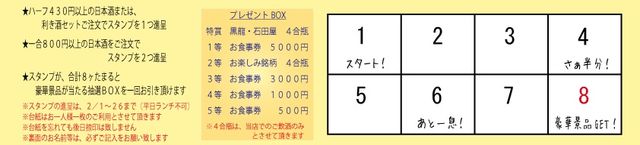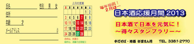 さて、毎年恒例!2月の 『日本酒応援月間』のイベント内容が正式に決まりましたのでご報告。 今年は、いつもとは異なり、震災時に行なっていた日本酒応援プロジェクト“蔵元に愛の一杯を”をベースにしたスタンプラリーを行います! ★ハーフ430円以上の日本酒または、    利き酒セットご注文でスタンプを1つ進呈 ★一合800円以上の日本酒をご注文で              スタンプを2つ進呈 ★スタンプが、合計8ヶたまると   豪華景品が当たる抽選BOXを一回お引き頂けます つまり、4合に付き、色んな物