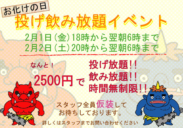 コミュを覗いて下さってる皆様 こんばんは(*^_^*) りなりーなです★☆ 今年もやってきましたお化けの日!! 去年大大大好評だったあのイベント!またやります目がハート 『時間無制限∞投げ放題!飲み放題!』 〜〜詳細〜〜 日時:2月1日(金) 18:00〜翌朝6:00    2月2日(土)  20:00〜翌朝6:00 会費:¥2,500円exclamation ×2     飲み放題,投げ放題,時間無制限です!! 2日間どちらでもOK!! 両日でも全然OK!! 飲んで飲んでexclamation 投げて投げてexclamation 皆でワイワイ騒ぎましょ目がハートぴかぴか(新しい)