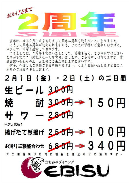 おかげさまで、立ち呑みダイニング EBISUは 来たる 2月1日をもちまして開店二周年を迎えることになりました。 こうして開店二周年が迎えられますのも、ひとえに皆様のご愛顧のおかげと スタッフ一同深く感謝いたしておりますm(_ _)m つきましては、二周年を記念し、感謝を込めて下記の通り感謝セールを行います。 ご多忙中とは存じますが皆様お誘い合わせの上、お気軽にご来店いただけますと幸いです。 何卒、今後ともご愛顧、ご支援を賜りますよう 心よりお願いいたしますと共に二周年のご挨拶を申し上げます。 生ビール 300円 →