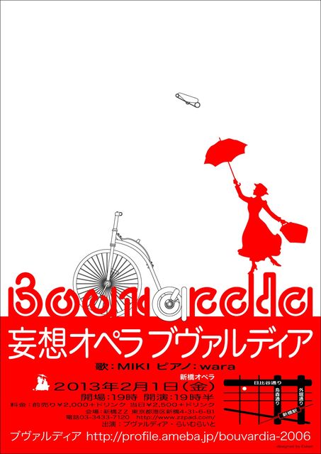2013年2月1日(金)開場:19時 開演:19時半 【新橋ZZ】http://www.zzpad.com/top01.html 住所:東京都港区新橋4−31−6−B1 電話:03−3433−7120 出演 ブヴァルディア http://profile.ameba.jp/bouvardia-2006 らいむらいと http://limelight.secret.jp/top.html 料金 前売り¥2000+ドリンク 当日¥2500+ドリンク