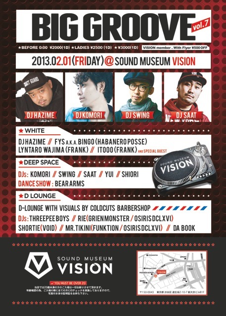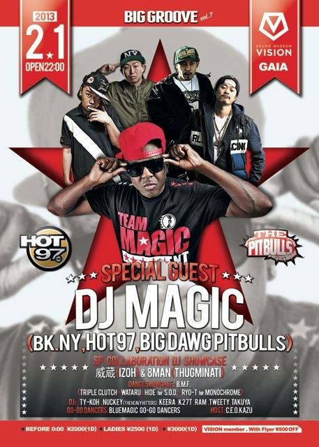 管理人様告知失礼いたします。 2月1日(金)に渋谷VISIONに DJ MAGICが登場 !! HAZINE,KOMORI,,TY-KOHに加え、2012 DMC WORLD DJ CHAMPIONSHIPS で見事世界一に輝いた、DJ威蔵と8MANのコラボSHOW♪ その他、超豪華顔ブレです ******************* メッセージ頂けましたら、特別DISCOUNT致します お名前+人数 をメッセージください ******************* 1月にJUST BLAZEのVISION再登場を実現し、多くのオーディエンスを狂喜させた“BIG GROOVE” が2月にも連続開催される。 今回はHOT 97の看板DJであり、Funk