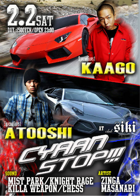 2013.02.02sat 【CYAAN STOP】今年から偶数月第一土曜レギュラースタート! KAAGOリリースPARTY!!! [GUEST] KAAGO ATOOSHI [MUSIC] MIST PARK KILLA WEAPON CHESS KNIGHT RAGE [ARTIST] ZINGA MASANARI DAY 1500YEN OPEN 23:00 @ClubSIKI 12月5日にリリースされた、KAAGOの1stアルバム「THE FIRST CHAPTER」はもう聴きましたか?[GUIDE ME] や [RISE AGAIN]、[TURN IT UP] など、MixCDや現場で耳にする機会も多い曲はもちろん、新曲をふくむ全15曲が収録された、まさに「1stにしてBEST盤」なアルバムに