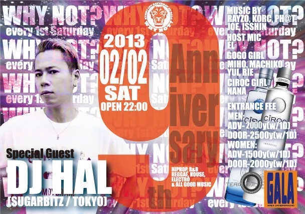every 1st Saturday 津市GALAで開催しているPARTY「WHY NOT?」 これまでに支えてくれた沢山の方々、遊びにきてくれたみなさんのお陰で2月の開催をもって9周年を迎えさせてもらえます。 ありがとうございます! そんな9周年に相応しいSPECIAL GUESTに東京よりDJ HALが初来三重! SUGARBITZ所属、数々のBIG PARTYへの出演、OFFICIAL MIXリリースをこなし、 東京若手No.1と言うよりも、もはや日本を代表するDJ そのPLAYは見逃し厳禁! そして9周年を華やかに彩る仕掛け沢山用意してます。 WHY NOT?常連さんもまだの方も楽しんで頂けます!