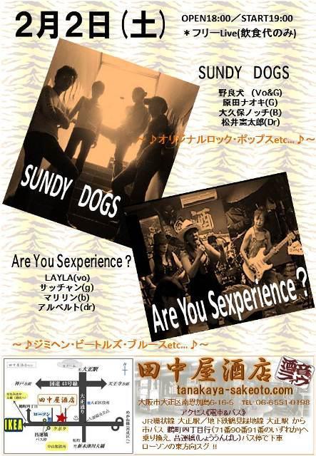 ★旧正月を皆で祝おう〜〜〜V(^0^)V★ http://www.tanakaya-sakeoto.com/ ノーチャージ(飲食代のみ) 18:00 OPEN 19:00 START セクペリ先行です☆ 20:00 SUNDY DOGさん