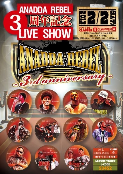 管理人様、告知失礼致します。 2013年2月2日 ANADDA REBELの3周年を記念し スペシャル生BAND SHOWが開催決定! 出演者にはANADDA REBELと親交の濃いアーティストが大集合!! 会場はアメ村バーガーキング横のCLAPPER! 終電までのLIVEイベントなのでもちろん未成年も入場OK!! 前売り券は限定200枚! ※入場規制がかかる場合がありますので前売り券購入をおすすめします! 【ANADDA REBEL3周年記念LIVE SHOW】 2013/2月2日(土) @アメリカ村 CLAPPER 前売り/2000円(1D別)200枚限定 当日/2500円(1D別) OPEN:19;00 LIVE START20:00 CL