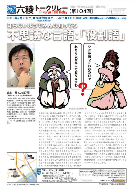 「知らないようでみんな知ってる不思議な言語:「役割語」」 【2月2日】 金水 敏さん@87期 大阪大学大学院文学研究科・教授 ==================================================== 六稜同窓会がお送りする生涯学習系プログラム ●六稜トークリレー http://www.rikuryo.or.jp/activity/talkrelay/ 【第104回】2月2日(土) 13:30開場 14:00開演 六稜ホール(六稜会館3F)にて 演題:「知らないようでみんな知ってる不思議な言語:「役割語」」 講師:金水 敏さん@87期 大阪大学大学院文学研究科・教授 1956