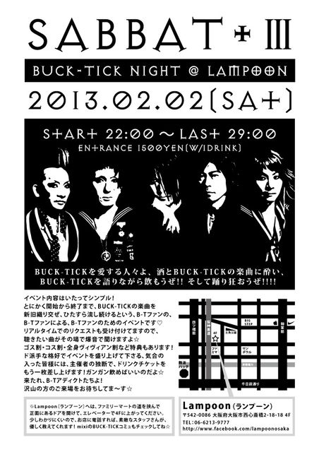 2007年に第一回のSABBATを桜川にあったライブハウス<montage>で開催してから、 アメリカ村のWhiteHorseを経て、足かけ6年!! ほぼ2年ぶりにヤリマス☆ BUCK-TICK好きの、BUCK-TICK好きによる、BUCK-TICK好きのためのイベント、「SABBAT」 (ちょっと定かではありませんが、たぶん回数で言うと今回が32回目?の開催になります。) 内容はいたってシンプル。 とにかく開始から終了まで、ひたすらBUCK-TICKの楽曲を、僭越ながら、私DJ 隆ノ介が選曲させていただき、ただただ流し続けるだけのイベントです!、リアルタイムでのリクエストも頂け