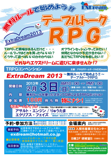 毎年恒例のEXDream定例イベントが今年も開催。 今回のテーマは「無料TRPGルール」です! インターネット等で無料で配信・配布されているルールを使って手軽にTRPGを始めてみませんか? 初心者の方やTRPGを知らない方でも気軽にご参加いただけるよう、ゲームマスターはサークルスタッフが担当します。 TRPGを遊んだことがないという方はもちろん、「オフラインセッション未経験」の方や、お友だちに「TRPGを布教したい」「遊ぶ仲間を確保したい」というベテランの方々も、ぜひお気軽にご参加ください。 「気軽に楽し