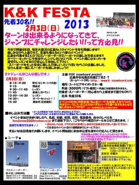 今年で開催4年目。 毎年大盛況の広島No1のイベント今年も開催します!! 楽しみながら上達できて、友達も増えるという夢のイベント♪♪ 広島を代表する2人のプロスノーボーダーがスノーボードの楽しみ方教えます!! オーリー・キッカー・オシャレ技などなど、今年は色々チャレンジしたいという方 みんなでワイワイ楽しみながらマスターしちゃいましょう!! K&Kの2人がプロスノーボーダーとして今までの活動で経験してきた知識やコツを教えます!! 皆さん!!是非一緒に滑りましょう!! ■□■□■□■□■□■□■□■□■□■□■□■□