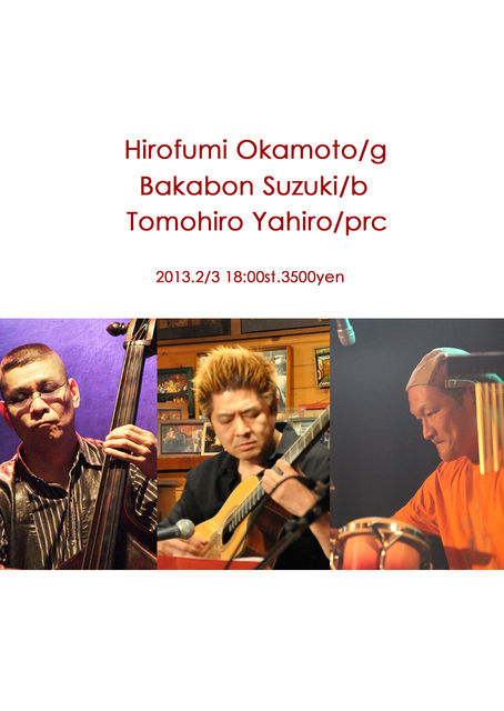 ライブのご案内をさせていただきます。。。 2/3(日) 岡本博文 岡本博文/g バカボン鈴木/b ヤヒロ・トモヒロ/prc SHOWTIME:18:00st. OPEN:17:00 CHARGE:\3500 今から10年以上前、岡本博文の1stソロアルバム『Jawango』の録音がきっかけで、集まった3人が、長きに渡って演奏を続け、完成度の高い音楽へと昇華。アコースティックギターの調べ、超絶なキメ、そしてラテンがキーワード。岡本博文の個性的なオリジナルを中心に3人一体となった熟成したタイトなグルーブは聴き応え十分。ヤヒロトモヒロ の縦横無尽なリズム、バカボン鈴木の強力サ