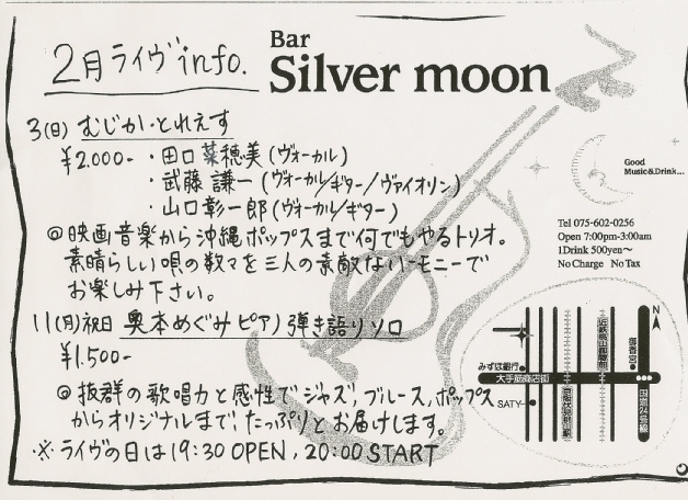 鬼は外に、福はうちに入れる節分の日、 居心地のいい、大人のBAR 伏見桃山「 シルバームーン」にて☆彡 寒い夜も楽しんでいただけるように、映画音楽から沖縄ポップスまで 色々な楽器と 3人のハーモニーで・・・ お待ちしていますョ♪ ご都合よろしければ、ぜひ お越しくださいね 2/3(日)京都伏見桃山 「Bar Silver Moon (シルバームーン)」 『むじか・とれぇす』 田口菜穂美(vo&uk) 伏見のジョン(vo&g) 武藤ケンイチ(g&vl&vo) start20:00 チャージ2000円 (ドリンク別途) 京阪伏見桃山駅、近