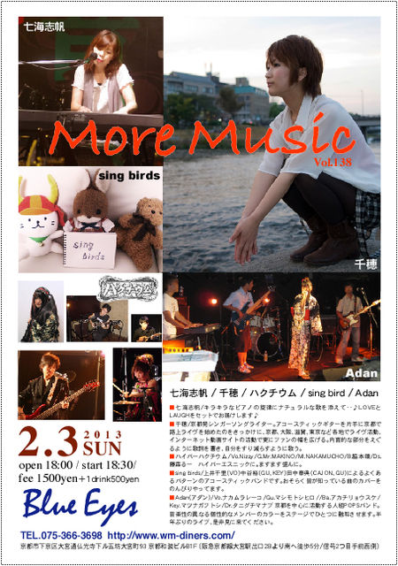★2月3日(日) More Music vol.138 open18:00/start18:30/ fee¥1500 (+1drink¥500) Live:七海志帆 / 千穂 / ハイパーハクチウム / sing birds / Adan ♪七海志帆 キラキラなピアノの旋律に、ナチュラルな歌を添えて‥♪ LOVEとLAUGHをセットでお届けします♪】 http://nanamishiho.jimbo.com ♪千穂 京都発シンガーソングライター。アコースティックギターを片手に、 京都で路上ライヴを始めたのをきっかけに、京都、大阪、滋賀、東京など各地でライヴ活動、 インターネット動画サイトの活動で更にファンの幅を広げる。代表作は「
