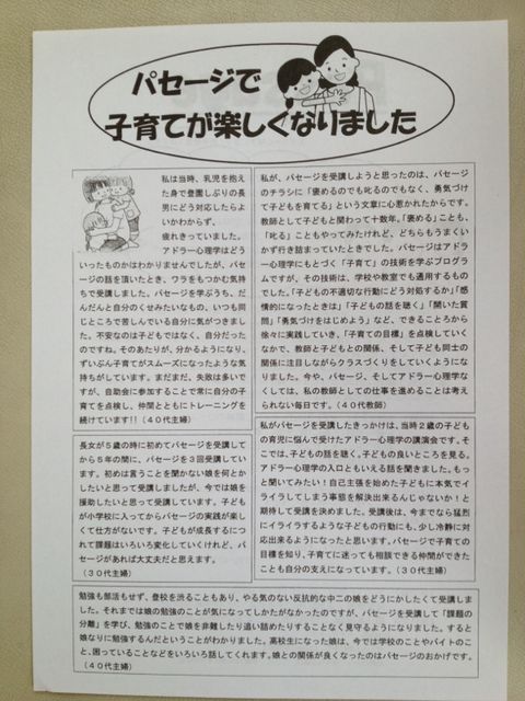 平成25年2月から三重県鈴鹿市でパセージが行なわれます。 パセージとは、アドラー心理学に基づく育児学習コースです。 興味のある方は是非パセージに参加してみませんか♪ パセージは、アドラー心理学に基づくあたらしい親子関係プログラムです。 子どもを叱らずに、勇気づけながら育てるにはどうしたらいいのか、 将来自立して、社会と調和して暮らせる子どもに育てるにはどんな点を工夫すればよいのかを、 グループワーク形式で実際の体験を事例にあげて学ぶため、とても実践的な講座です。 《日時》 2月3日(日)
