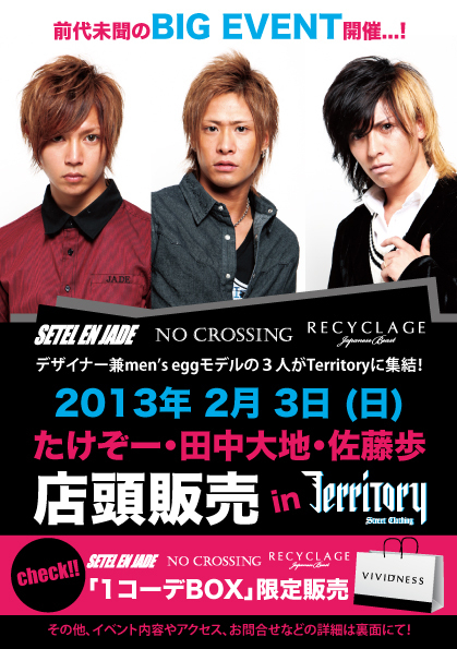 来る、2月3日(日)、Territoryにて 「たけぞー」「田中大地」「佐藤歩」3人による店頭販売を開催します!! 今までにありそうで無かったイベントが遂に実現!! 「たけぞー」 「田中大地」 「佐藤歩」 この3人が一気に揃うのはTerritoryが初!! まさにレアです!! さらに!今回の店頭販売では今まで通り ¥5,000以上お買上げのお客様には記念撮影&サインのプレゼントという内容に加え、 スペシャルなアイテムをご用意します! その名も「1コーデBOX」!! 「setel en JADE」 「NO CROSSING」 「RECYCLA