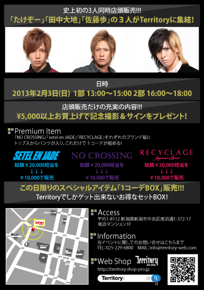 来る、2月3日(日)、Territoryにて 「たけぞー」「田中大地」「佐藤歩」3人による店頭販売を開催します!! 今までにありそうで無かったイベントが遂に実現!! 「たけぞー」 「田中大地」 「佐藤歩」 この3人が一気に揃うのはTerritoryが初!! まさにレアです!! さらに!今回の店頭販売では今まで通り ¥5,000以上お買上げのお客様には記念撮影&サインのプレゼントという内容に加え、 スペシャルなアイテムをご用意します! その名も「1コーデBOX」!! 「setel en JADE」 「NO CROSSING」