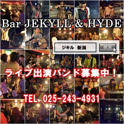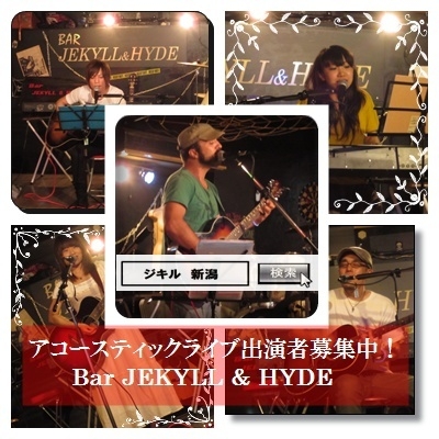 管理人様ライブ告知失礼いたします。 ■2/3(日)アコースティックライブ開催! ジキルストリートライブVOL.1開催! ■主催/会場:JEKYLL&HYDE http://www17.ocn.ne.jp/~jekyll/ ■18:00〜START ■観覧者は/\1200/1drink/チケットは発行しておりせんので直接お越しください。 ■出演 ■ささパンダ ■Coz'e(コズエ) ■まぁくん ■田村英徳 ■坂本祐介 ■大宇宙超能力少年団 当店では随時、ライブ出演者を募集しております。 お気軽にご相談ください。