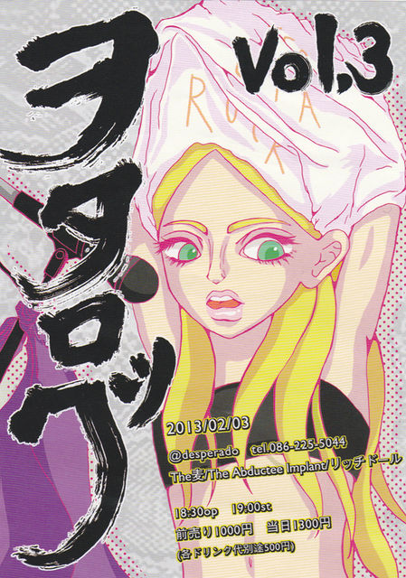 〜 ヲタロック vol.3 〜 【日 時】2013.02.03(SUN) 開場 18:30 / 開演 19:00 【場 所】Live House Desperado-OKAYAMA- (http://www.desperado-okayama.com/) 岡山市北区表町3丁目11-105 086-225-5044 【入場料】前売 \1000 / 当日 \1300(ドリンク代\500が必要です) 【出演者】 ・THE!麦 ・リッチドール ・The Abductee Implant ※※ チケットの取り置きはメンバ〜へ連絡をお願いします ※※