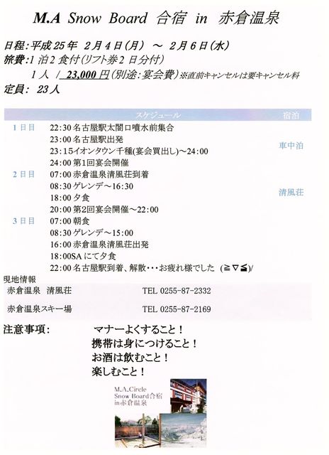 みなさんお待たせ致しました(^^)/~~~ 待ってないとか言わないで(T_T) 第3回スノボ合宿開催決定しましたよ(>_<)ゞ 今シーズンは2月4日月曜日夜出発〜2月6日夜帰宅で赤倉温泉スキー場へ貸切バスで行っちゃいます(^_-) 来るしかないでしょ(^皿^)v(笑) パンフレット添付したんで見てくださいm(_ _)m 質問もお気軽に(^^)/~~~