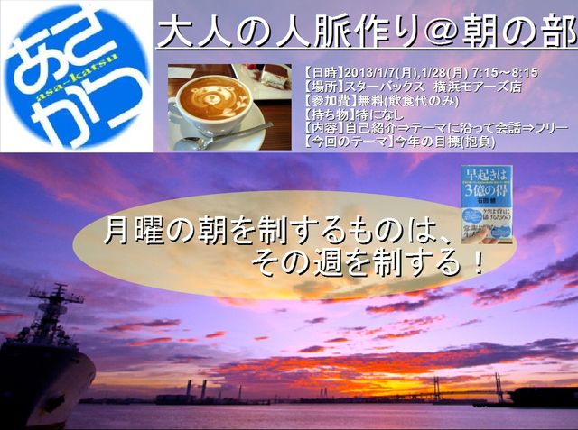 ちょこっと大人の、ちょこっと真面目な人脈を作りたい。 そんなあなたに。交流会@朝の部の案内です。 いつもご参加ありがとうございます。 「月曜の朝を制するものは、その週を制する!」 「一週間の計は、月曜の朝にあり」 「早起きは3億の得」 限られたれた時間を有効活用して、素敵な出会いをしましょう。 気軽に、安心してご参加ください。 コンセプト ・女性でも安心して参加できる雰囲気 ・せま〜くふか〜い人間関係の構築 ◆イベント詳細◆ 〜〜〜〜〜〜〜〜〜〜〜〜〜〜〜〜〜〜〜〜〜〜〜〜 【日時】