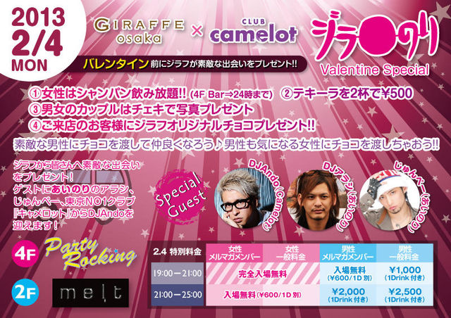 一足先に本日バレンタイン企画やっちゃいます! いよいよ今夜大阪NO1人気クラブGIRAFFEosaka にて、 東京の超有名イベントラブビートのメンバーが登場しちゃいます!! 国内なら倖田來未、K-POPアーティストならJYJ(東方神起)海外アーティストならFlo Rida等に楽曲提供している東京の人気DJ Ando あいのりメンバーでカメラマンそしてDJ等でも都内で大活躍中の『アラシ』 そして、あいのりめんばーでもあり、現在アイドルグループ『カレナイ』メンバーのじゅんぺーが登場 更に特典満載! 1、女性は4Fに