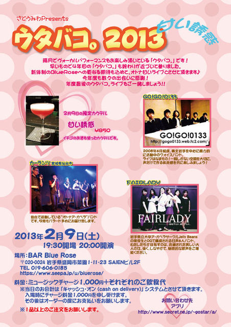 ウタバコ。2013 -甘い誘惑- 日時:2013年2月9日(土) 19:30開場 20:00開演 場所:BAR Blue Rose 〒020-0024 岩手県盛岡市菜園1-11-23 SAIENビル2F TEL 019-606-0185 http://www.seepa.jp/u/bluerose/ 料金:ミュージックチャージ1,000円+それぞれのご飲食代 ※当日のお会計は「キャッシュ・オン(cash on delivery)」システムとさせて頂きます。 入場時にチャージ料金1,000円を申し受けます。 その後はオーダーの度にお支払いをお願いします。 ※1品以上のご注文をお願いします。 お問い合わせ先: アプリ(佐藤) http://www.secret