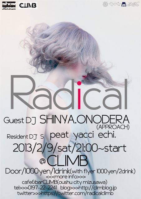 1年で一番寒い2月ですが元気にRadical開催でございます!! 今回のゲストは一関 花泉で乱痴気騒ぎを繰り広げている「APPROACH」 より県南屈指のパーティアニマル「SHINYA.ONODERA」氏をお迎えする事になりました!! 極限までPARTYを楽しむ男、「SHINYA.ONODERA」氏のDJplayを乞うご期待!! 2013/2/9/sat/21:00~start/1000yen(with1drink) 毎度ながらフライヤーを持参していただくと1000円で2ドリンクとなりますので是非ともフライヤー入手してからご来場くださいませー