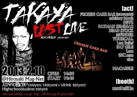 2013.2.10 MACARBLEpresents TAKAYA lastlive 【act】 FROZEN CAKE BAR (yamagata) VICE advisory booth DEVZ FATMAN SEMINAR DEAD STOCK 3$FINGER YOURCALL Last Belief FAT GILE Laut 杏仁cute MACARBLE PLACE=Hirosaki Mag-Net OPEN=14:30 START=14:45 ADV=\1300 DOOR=\1500 (+1drink500) Highschoolstudent=\500