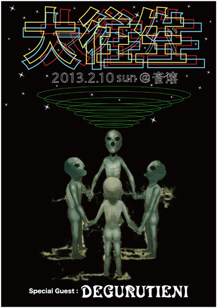 “大阪発の歌う怪詩人” DEGURUTIENI(デグルチーニ)を迎えての大往生!! トム・ウェイツを思わせる日本人離れしたダミ声がノスタルジックな猥雑さを持つ50年代ごろのヨーロッパ映画、もしくはトリッキーなサーカス、はたまた彼の詩に登場する“スキャンダラスな天国”のような奇怪で夢の一幕の様な世界をつくりだす。 ★大往生 2013.02.10(sun)@oto-doke ★会場 アンダーグラウンドDJバー 音溶 松山市三番町2丁目10-9 第3クリーンビル3F ★Guest Live DEGURUTIENI (大阪) 人デグルチーニ、 妖精ヤブリンコーネ、 バイオリニ