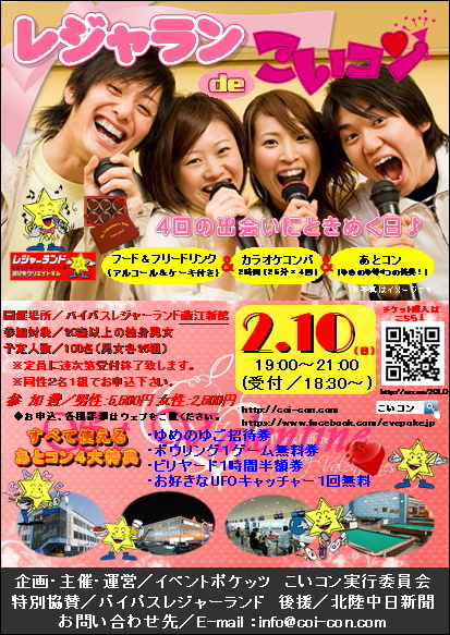 話題の街コン゛こいコン″がレジャランに初上陸! 加賀・宇ノ気で大好評だったカラオケ店を舞台に新しい出会いの形♪ 4回のときめきに出会える日☆ バレンタイン目前に運命的な出逢いがあるかも♪ ◆カラオケ2時間×フード&フリードリンク(アルコール、ケーキ付き)×あとコン ◆すべて使えるあとコン特典: ゆめのゆ招待券、ビリヤード半額券、ボウリング1ゲーム無料券、UFO キャッチャー1回無料 等 ◆日 時:2013年2月10日(日) ・受付・・・18:30〜 (受付開始 〜19:45まで受付対応)