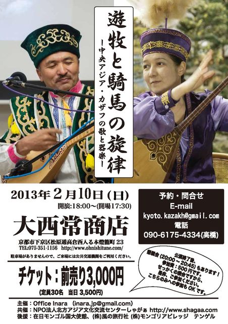 遊牧と騎馬の旋律―中央アジア・カザフの歌と器楽― 日時:2013年 2月10日(日) 17:30開場・18:00開演 出演:イナーラ・セリクパエバ(カザフスタン共和国) リヤス・クグルシン(モンゴル国) 会場:大西常商店(京都市下京区松原通高倉西入る本燈籠町23) http://www.ohnishitune.com/ チケット: 予約 3000円 当日 3500円 なお公演終了後,演奏者を囲んだ懇親会があります(20:00〜20:45) 参加費は500円です ☆ご予約を希望される方は,kyoto.kazakh@gmail.com まで,お名前,予約人数,連絡先をご記入の