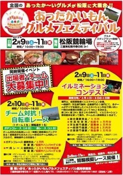 ◇チーム対抗!自転車レース申込概要 1, 概要 ・場 所 松阪競輪場内競技バンク ・開催日時 2013年2月10日、11日 ・開催時間 10:00〜16:00 ・応募締切 2013年1月20日まで ・部 門 一般部門・学生部門・企業部門の3部門(各部門10チーム) ・参加料 ◆ガチンコレース 10日 2,000円/人(1チーム3名=6,000円となります。) ◆一般レース 11日 1,000円/人(1チーム3名=3,000円となります。) ※参加費には500円分のグルメエリアで使えるグルメチケットが付きます。 ※申し込み後、1週間以内に下記振込先ま