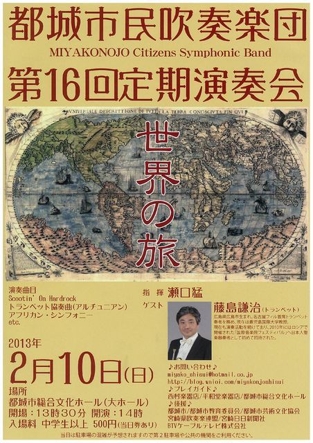 都城市民吹奏楽団 第16回 定期演奏会 <世界の旅> 日時:2013年2月10日 日曜日 開場13:30 開演14:00 会場:都城市総合文化ホール 大ホール きりしま 入場料:¥500(中学生以上) 指揮:瀬口猛 ゲスト:藤島謙治(トランペット) 曲目: ・スクーティン オン ハードロック(ホールシンガー) ・トランペット協奏曲(アルチュニアン) ・アフリカンシンフォニー(ヴァンマッコイ) ほか みなさまのおこしをおまちしております
