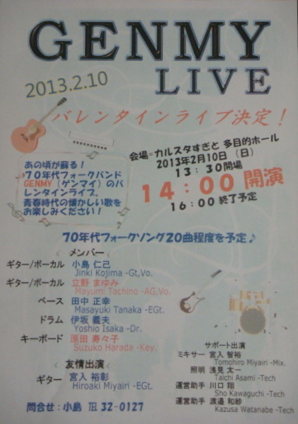 友達がライブをやるのでお知らせします。 GENMY(げんまい)バレンタインLIVE 日時:2月10日 13:30開場 14:00開演 場所:カルスタすぎと 多目的ホール 入場無料 70年代フォークソングが中心です。出演者は大体50代で、カルスタでは毎年1回、今年で4回目になります。