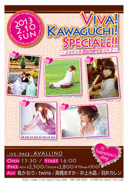 2/10(日) 川口CAVALLINO http://www.live-cavallino.com/ 「VIVA! KAWAGUCHI! SPECIALE!!(スペチャーレ) 〜バレンタインライブ〜」 開場…15:30 開演…16:00 出演…20:00(5組中ラスト) 料金…\2500/\2800(前/当) (+1drink) サポート ピアノ・福島環 パーカッション・セクシー バイオリン・midori 他出演者 16:00〜 羽井カレンサン http://ameblo.jp/karenwy/ http://twitter.com/karen_wy 17:00〜 井上水晶サン http://ameblo.jp/inouemia http://twitter.com/MIA__crystal 18:00〜 高橋あす