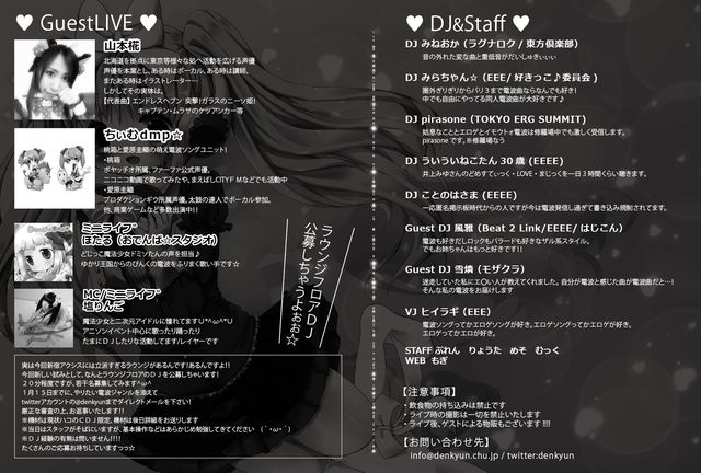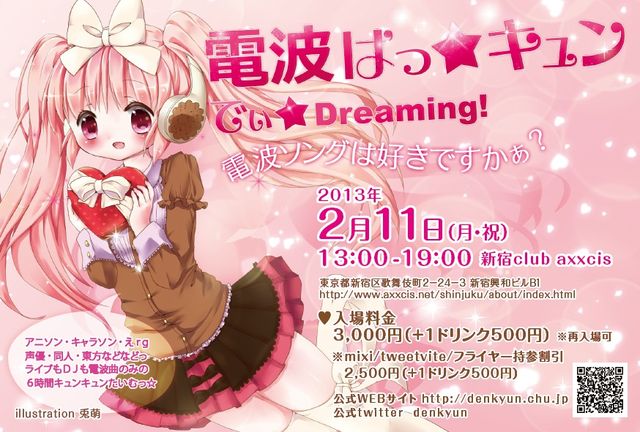 電波はっ☆キュン でぃ☆Dreaming! 〜電波ソングは好きですかぁ?〜 電波ソング好きなDJと電波なゲストさんによる、 電波ソングクラスタのためのイベント、第5回目ですっ みんなで合いの手楽しい電波っ! 電波といえばあの曲ぅ〜な鉄板曲から 他のイベントではかからないような、マイナー電波 埋もれてしまっているあの隠れた良電波 一度聞いたら耳から離れない上質の電波 えrg・同人・アニソン・キャラソン・東方などなど たくさんご用意しましたっ! ■twipla http://twipla.