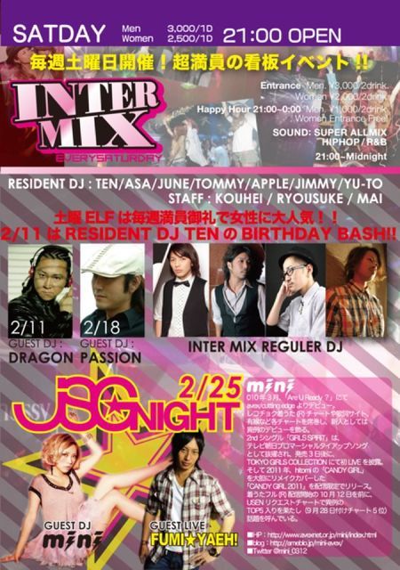 毎週土曜日開催!エルフ看板イベント! B2メインフロアでは、ビルボードヒットを中心に、様々なジャンルのヒット曲のみで構成されたオールミックスPARTY!!! CLUB ELF RESIDENT『DJ TEN』のBIRTHDAY BASHをELFの看板EVENT『INTER MIX』にてお祝いします!! DJ TENを知っている方、LADY BiRDのファンの方、是非皆でお祝いして盛り上げましょう!! さらに、B1フロアでは都内で活躍中のDJによる最新のHIP-HOP,R&Bが楽しめます。 ご連絡をい