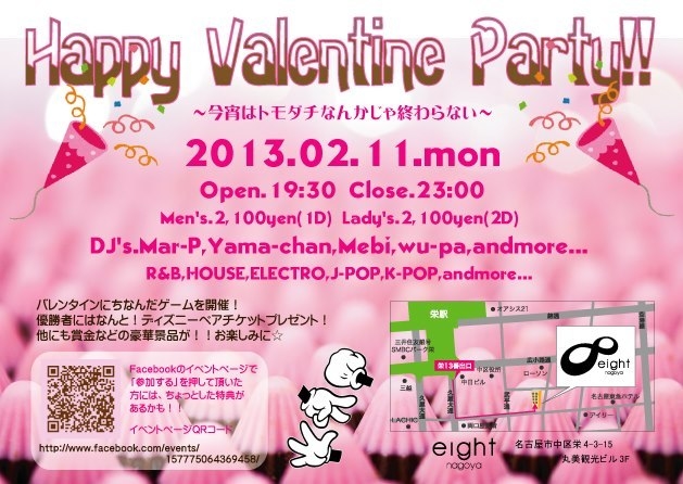 はい、やりますよ!バレンタインパーティ! チョコよりもっと素敵な、ディズニーペアチケット当たりますよっと!! ★★★★☆☆☆☆☆☆☆☆☆☆☆☆☆☆☆☆☆☆☆☆☆☆★★★★ DJによる音楽と、おいしいお酒で、バレンタインを素敵に彩ります!! でも、ただお酒を飲みながら踊るのなら、いつものクラブでもできるよね? せっかくのバレンタインなんだから、たくさんの人に出会っちゃおう!! だから、バレンタインにちなんだゲームもやっちゃいます!! はじめましてでもいろんな人との仲良くなれる、あのゲームやり